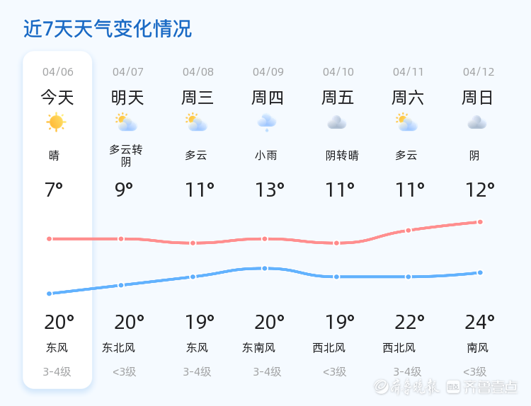今日(4月6日,星期一,农历二月十九),济宁市迎来晴转多云的好天气,全市各区均以晴到多云为主,气温适中,东北风1级,空气湿度52%,PM2.5指数为71,整体空气质量良好。