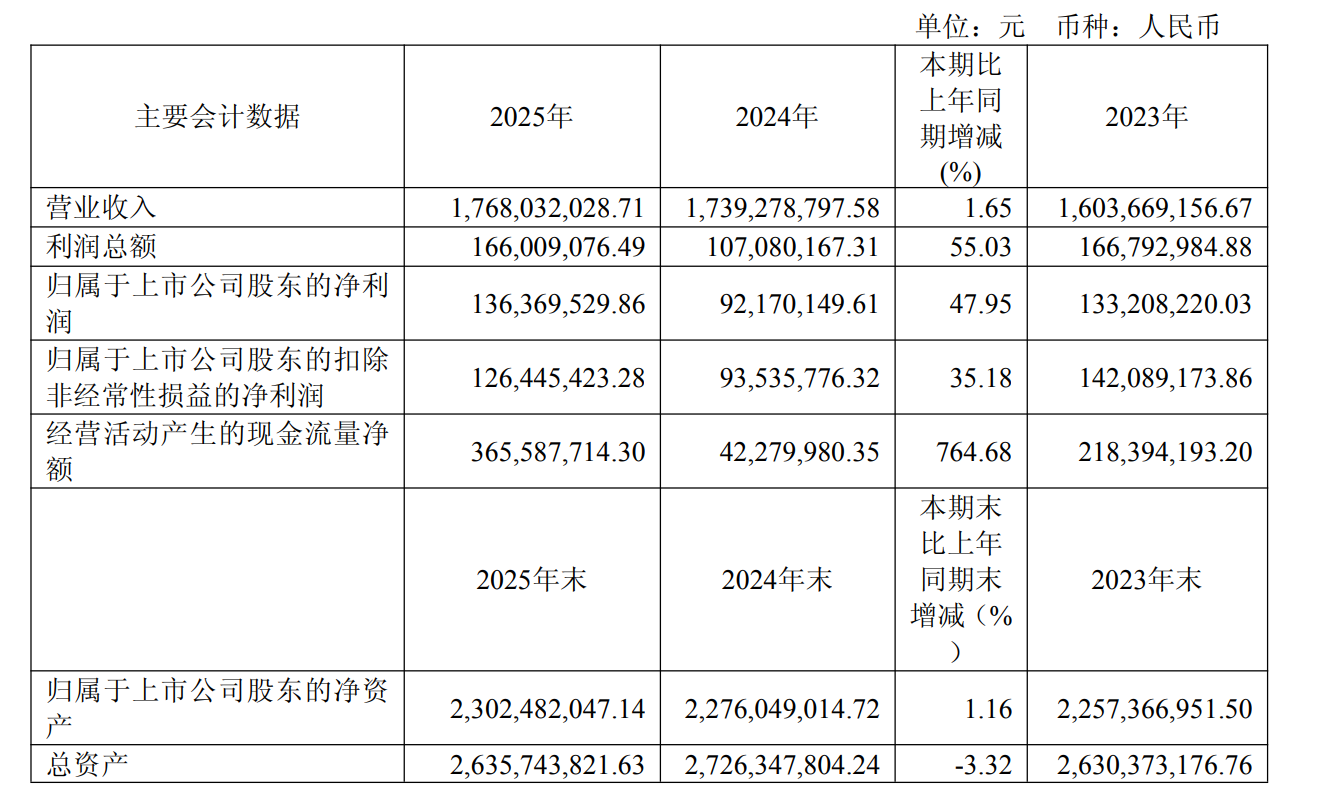 4月3日,金麒麟(603586.SH)披露的2025年年报显示,报告期内,公司营业收入为17.68亿元,同比增长1.65%;归母净利润为1.36亿元,同比增长47.95%;扣非归母净利润为1.26亿元,同比增长35.18%;基本每股收益0.70元。