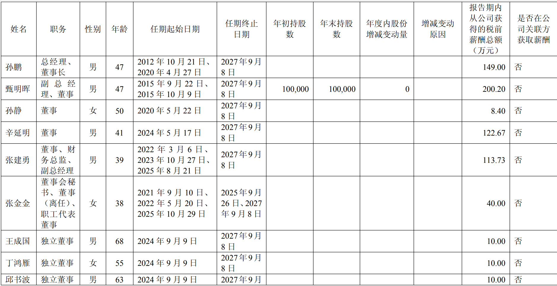 从2025年金麒麟董事及高管的薪酬情况看,副总经理、董事甄明晖薪酬最高,为200.20万元,副总经理王振中年薪155.35万元,总经理、董事长孙鹏的薪酬为149万元,董事辛延明的薪酬为122.67万元,董事、财务总监、副总经理张建勇的薪酬为113.73万元。