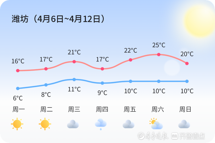 全市周平均最高温19℃,平均最低温9℃,平均气温14℃,周最高气温25℃,出现在周六,周最低温6℃,出现在周一。
