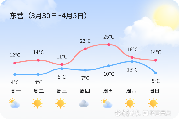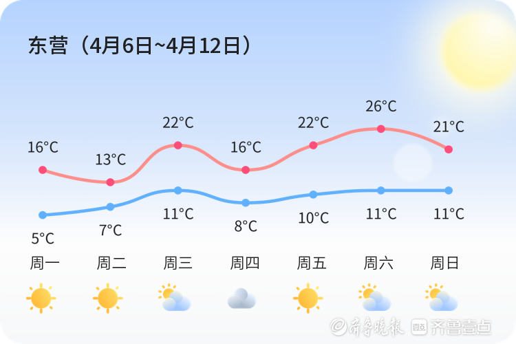 全市周平均最高温16℃,平均最低温7℃,平均气温11℃,周最高气温25℃,出现在周五,周最低温4℃,出现在周一、周二。