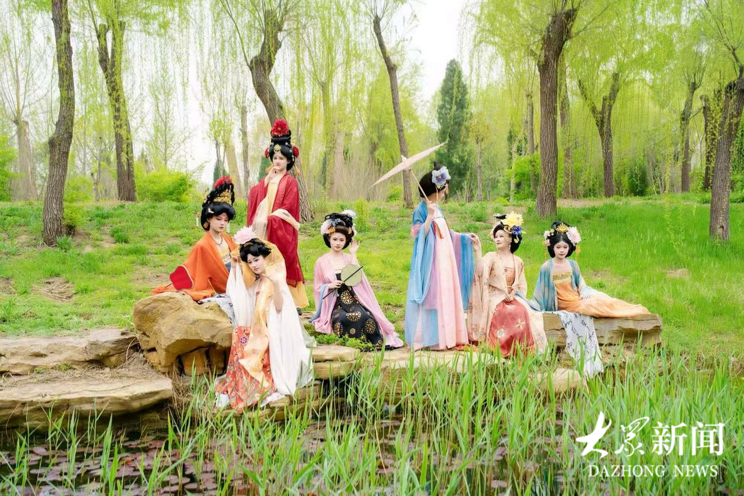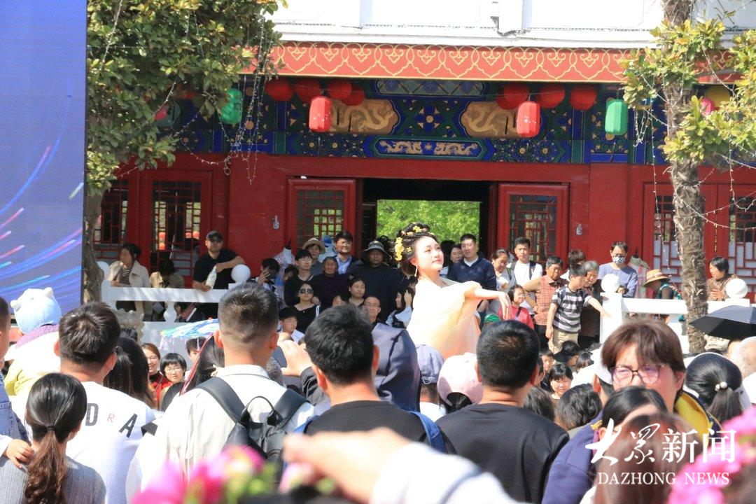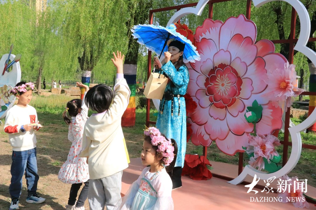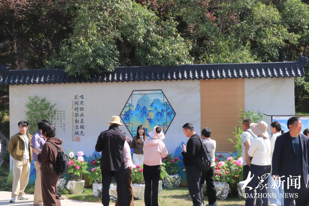 画面三:在一处打卡点,游客竞相与举着花伞的“牡丹仙子”合影。曹州牡丹园围绕“1花王+12花神”体系,在全园布设了方言墙、美陈装置、沉浸式小场景、地面彩绘等30余处打卡点。每一处点位都融合牡丹文化与菏泽地域特色,既适合拍照分享,又植入文创展售、非遗体验。在设计理念上融入年轻化的情感表达和社交传播逻辑,让静态景观成为可对话、可共鸣、可传播的载体。同时引入汉服游园,配套妆造、跟拍服务,让游客在打卡的同时,从“观花”转向“入画”,丰富沉浸感受。