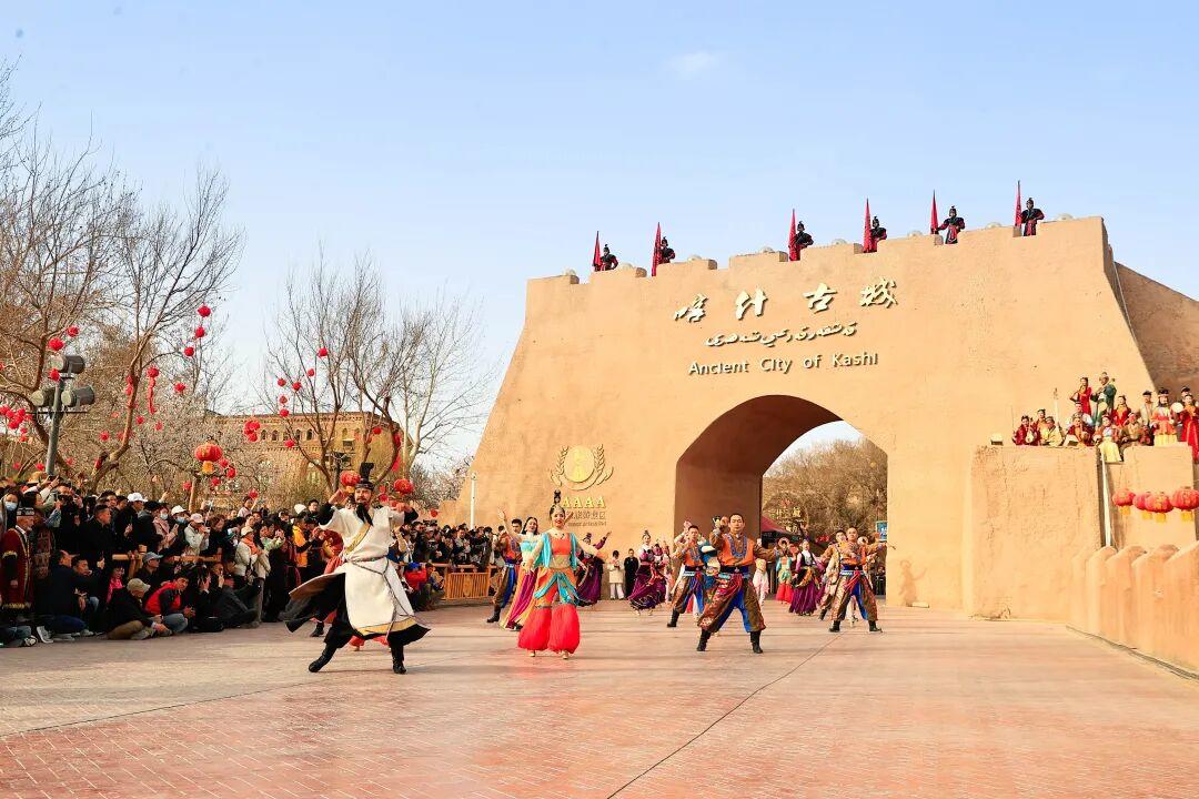 4月4日10点30分,喀什古城东门,开城仪式的鼓声准时响起。身着传统服饰的舞者在城门下旋转起舞,游客们举着手机和相机围得里三层外三层。