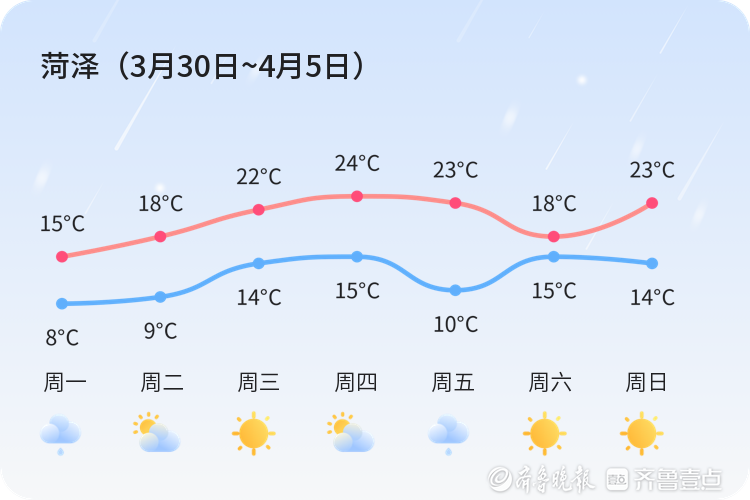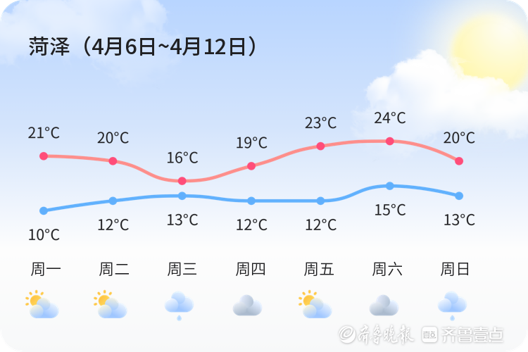 全市周平均最高温20℃,平均最低温12℃,平均气温16℃,周最高气温24℃,出现在周四,周最低温8℃,出现在周一。