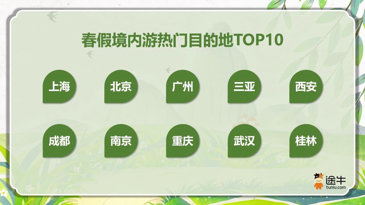 自驾游和自由行备受春假用户青睐,出游人次占比分别为40%和37%。其中,上海、北京、广州、三亚、西安、成都、南京、重庆、武汉、桂林等目的地是途牛用户春假期间境内游更为热门的选择。