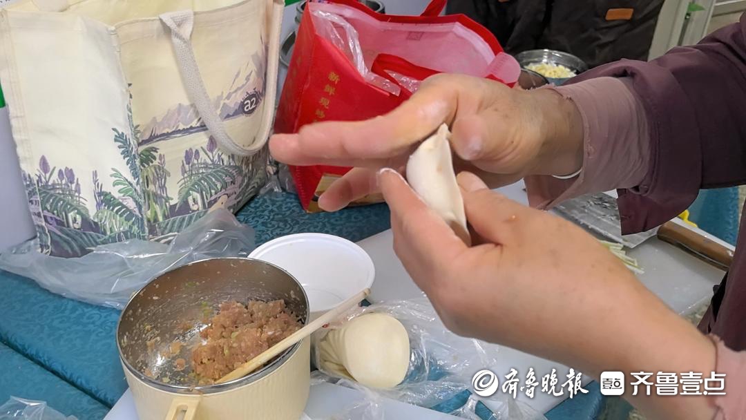 在爱心厨房,姜阿姨正给外孙女包萝卜瘦肉馅的水饺。
