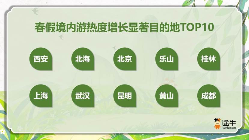 从客源地来看,今年实施春假且时间安排和清明假期连休的城市中,南京、合肥、成都、贵阳、重庆、苏州、无锡、常州、绍兴、扬州等地途牛用户出游意愿更为强烈,跻身“春假热门客源地”榜单前列。