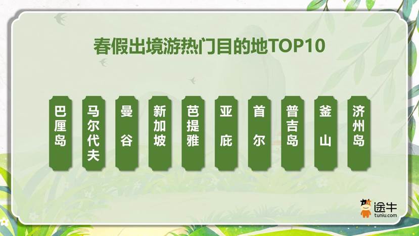 春假与清明假期连休,也为错峰出境游创造了有利条件。《报告》数据显示,除中国香港、中国澳门外,巴厘岛、马尔代夫、曼谷、新加坡、芭提雅、亚庇、首尔、普吉岛、釜山、济州岛等境外目的地热度攀升,成为途牛用户春假和清明假期出境游的热门之选。