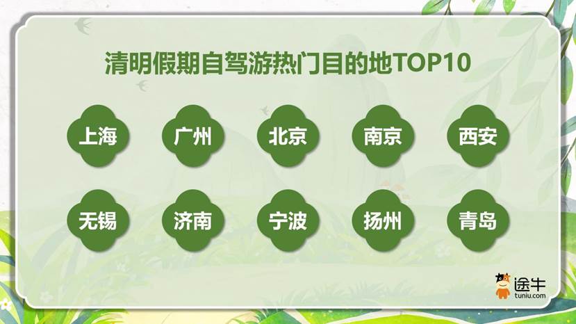 自驾游、自由行主导清明假期。其中,上海、广州、北京、南京、西安、无锡、济南、宁波、扬州、青岛等位居“清明自驾游热门目的地榜单”前列。