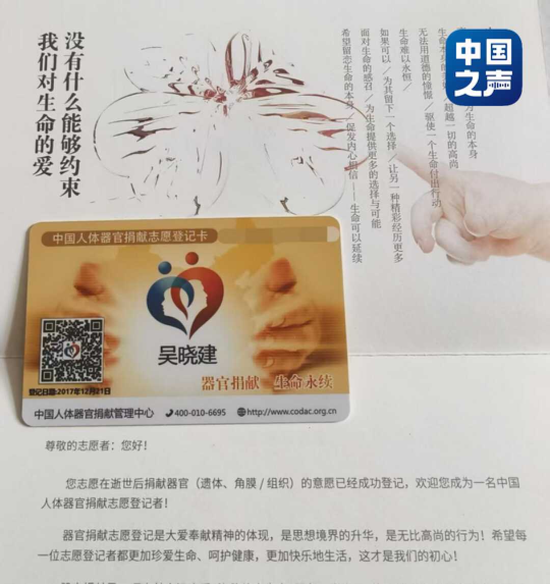 作为捐献者家属,吴晓建跟随父母的脚步,成为一名人体器官捐献志愿登记者。从最初的遗体捐献,到后来扩充为角膜、器官乃至遗体的全面捐献,吴晓建的想法简单而坚定:“能用角膜就用角膜,能用器官就用器官,实在都不能用了,就用遗体,物尽其用就好。”