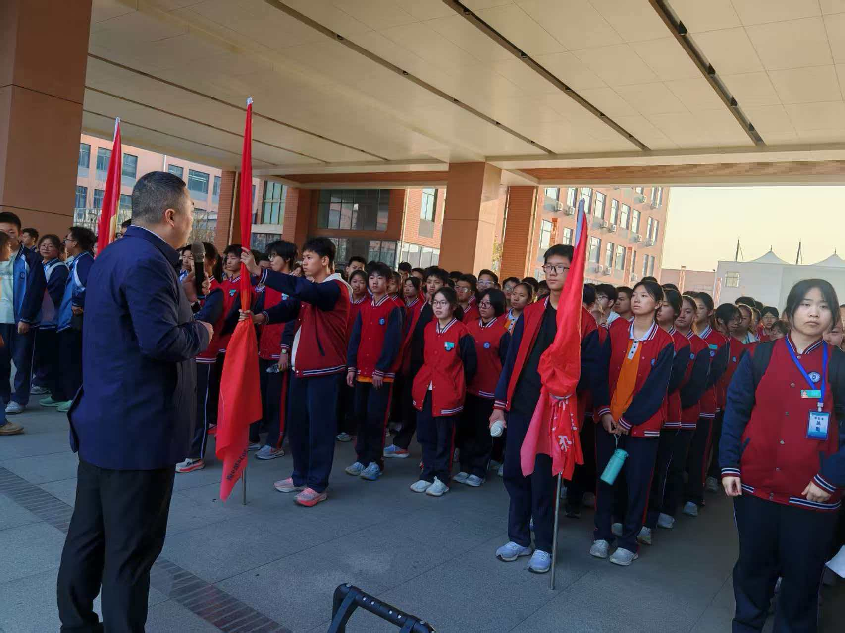 清晨7:00,八年级8班教室已是一片忙碌。班主任再次重申安全、纪律与卫生要求,同学们认真聆听,整装待发。7:10,电教室楼下红旗猎猎,班旗飘扬。8班同学身着整齐校服,精神抖擞列队集合。副校长刘钊作动员讲话:“用脚步丈量信仰,用行动致敬先烈!”一声令下,队伍如长龙般昂首出发。