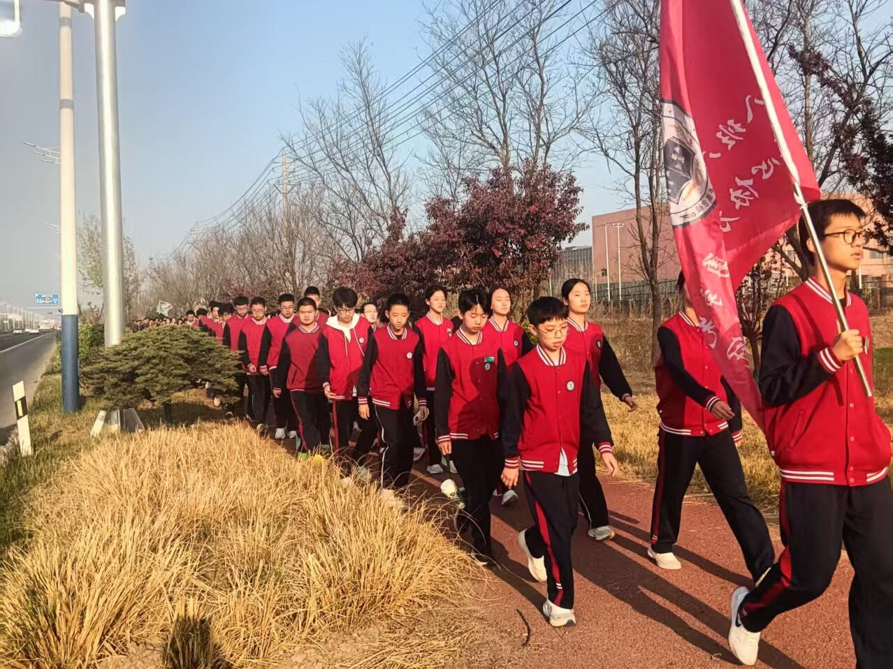 初二在前,高一在后,两路纵队以班旗引领。八年级8班的旗手走在最前,红色班旗在春风中猎猎作响。途中,交警五中队民警与蓝天救援队队员在各路口保驾护航,家委会车辆默默跟随队尾。尽管腿脚酸胀,无人叫苦掉队。有同学擦着汗笑道:“想想当年的战士,这点累算什么?”