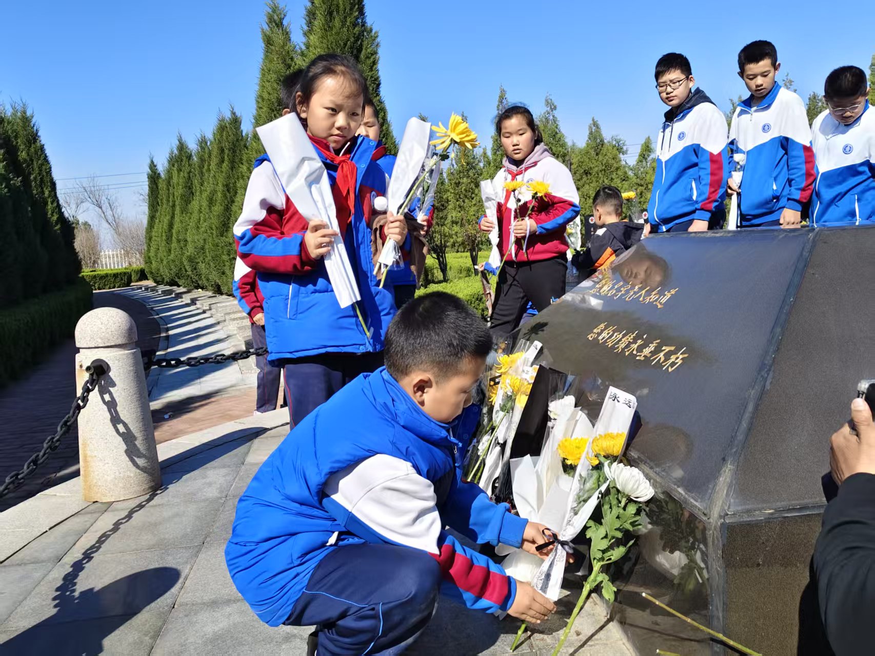 4月4日,河口区志愿者协会组织百余名小志愿者走进河口区烈士陵园,开展“缅怀革命烈士,传承红色基因”清明祭扫活动。