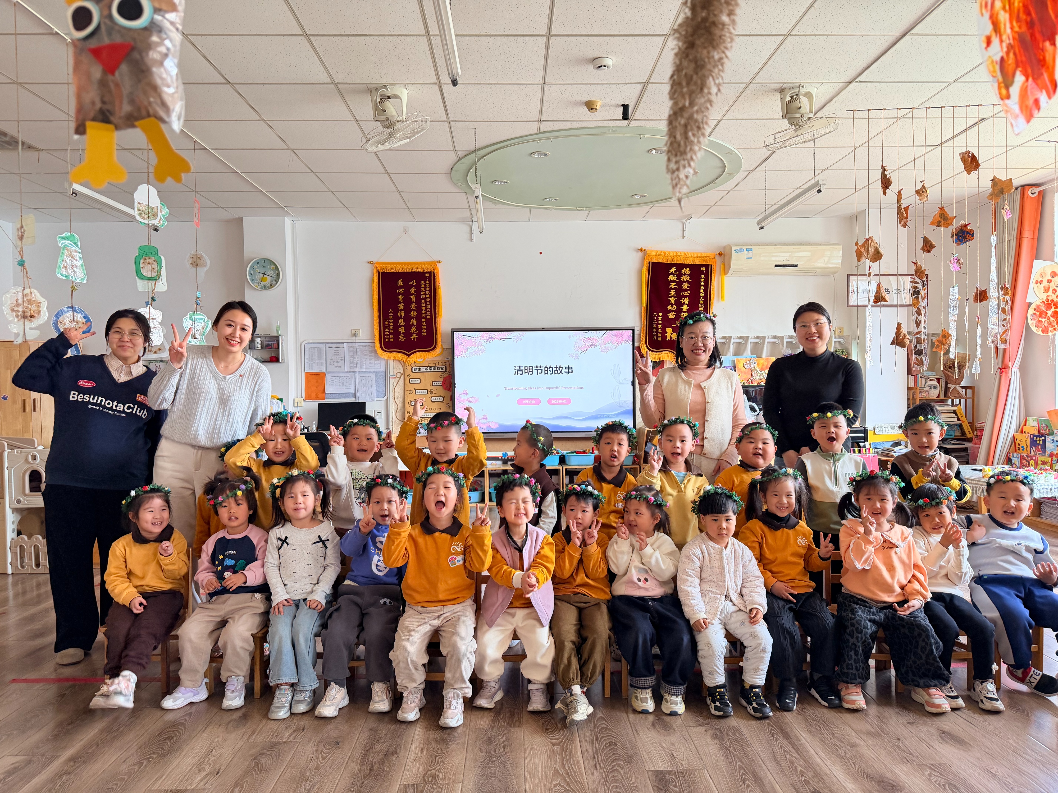 活动伊始,受邀家长化身“课堂老师”,用生动易懂的语言向孩子们讲解清明节的由来与传统习俗,介绍踏青、插柳、扫墓、放风筝等民俗文化,引导幼儿理解清明时节缅怀先人、亲近自然的节日意义。随后,在家长与老师的共同指导下,孩子们动手制作清明手工花环,大家认真穿编、装饰,将柳枝与鲜花巧妙结合,一个个饱含春意与心意的花环陆续完成。活动最后,师生与家长共同合影留念,定格温馨美好的传统节日瞬间。
