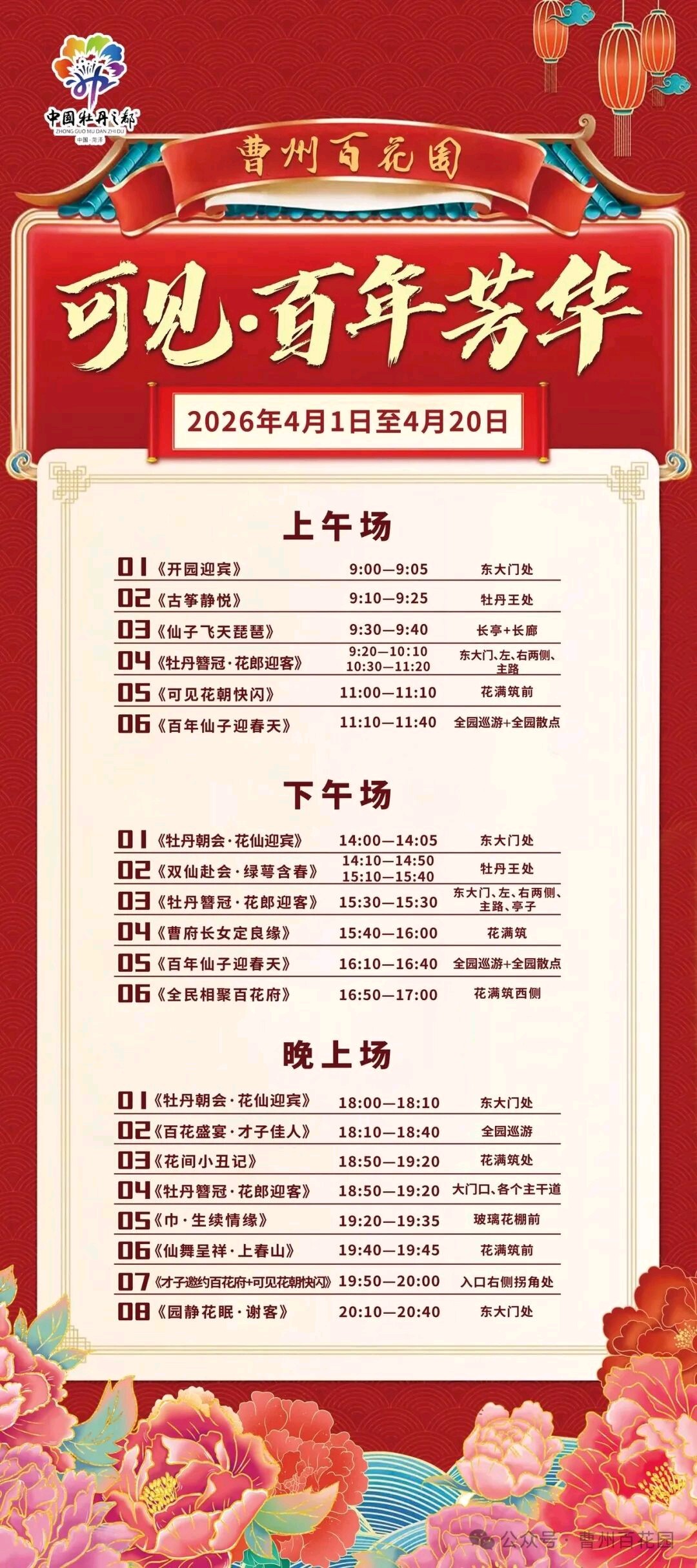 4月1日至20日,曹州百花园「可见·百年芳华」主题演艺盛大开启,早中晚三场20个演艺节目,打造全时段沉浸式游园新体验!