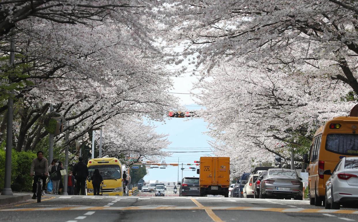 4月3日,韩国釜山海云台附近樱花绽放。新华社记者 姚琪琳 摄