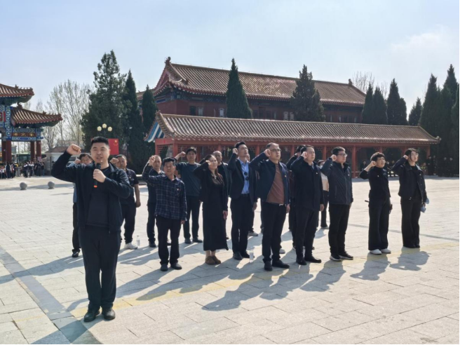 下午的鲁西南烈士陵园,松柏掩映,庄严肃穆。“鲁西南革命英雄纪念碑”巍然矗立,镌刻着无数革命先烈的浴血荣光。全体党员整齐列队,垂首默哀,向为民族独立、人民解放和为国家富强英勇献身的先烈们深深三鞠躬,表达无限哀思与崇高敬意。默哀毕,全体党员高举右拳,面向党旗庄严宣誓:“我志愿加入中国共产党,拥护党的纲领,遵守党的章程……”铿锵誓言回荡在陵园广场,字字千钧,既是向革命先烈的深情告慰,更是新时代共产党员对党忠诚、服务人民的郑重承诺。