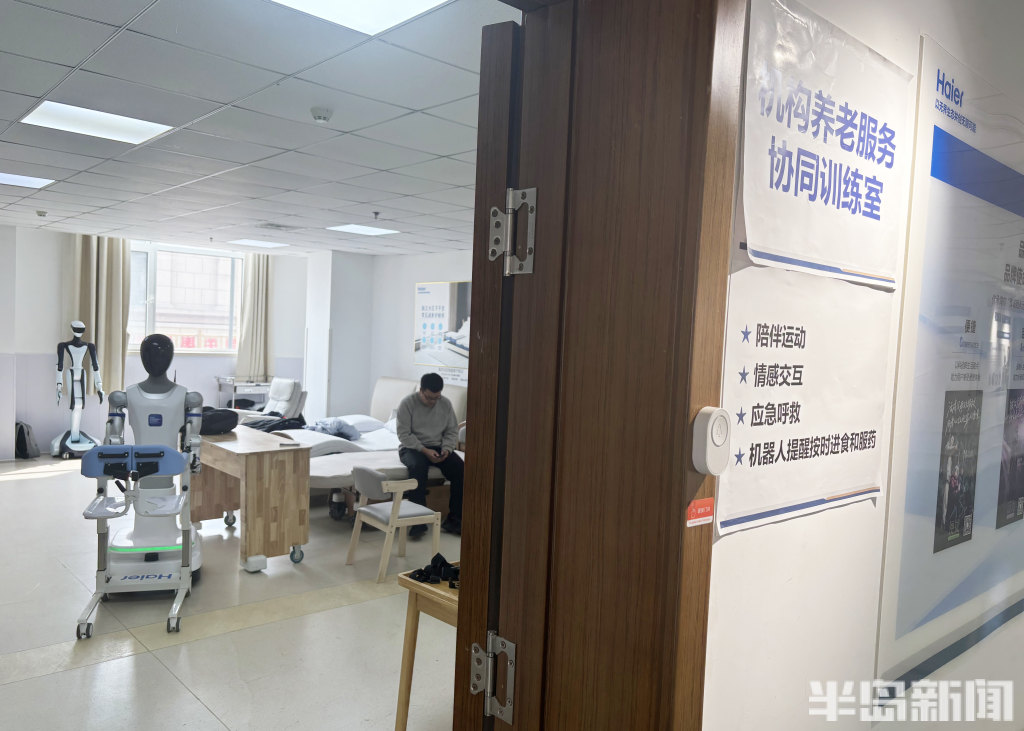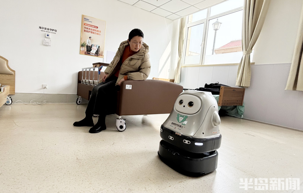 青大一路附近一家养老院内,陪伴机器人在进行护理工作的测试