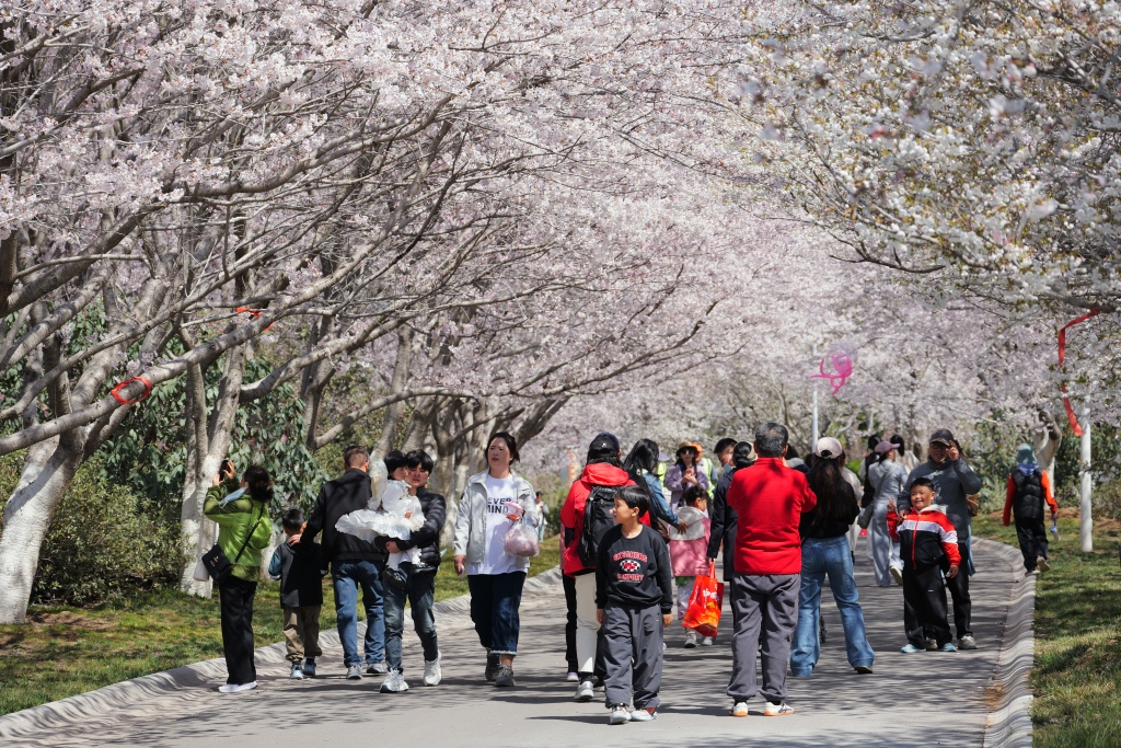 “刚入园便被大片樱花花海震撼,粉白花瓣随风飘落,像闯进了童话世界。”来自青岛市区的游客张心悦带着家人在泽丰生态园驻足拍照。作为清明假期核心文旅IP,画美达尼第三届樱花节早已成为周边市民踏青赏春的必选打卡项。园区内万株樱花次第绽放,早樱粉嫩清丽、晚樱雍容浓艳,交织成浪漫无边的花海;微风轻拂,落樱纷飞如雨,引得游人纷纷驻足定格美景。不少游客搭乘特色赏樱小火车,穿梭于繁花林间,将沿途春光尽收眼底;花朝市集更是人头攒动,樱花主题文创手作精巧别致,特色风味小吃香气四溢,浓浓的春日烟火气扑面而来。