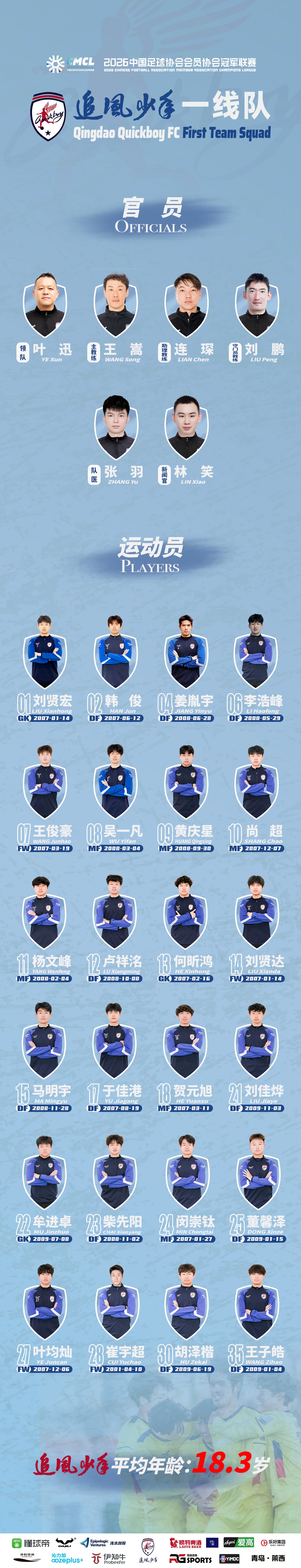 近日,青岛追风少年公布了球队在新赛季的大名单,平均年龄18.3岁的青春气息着实让中冠刮起青春风暴。