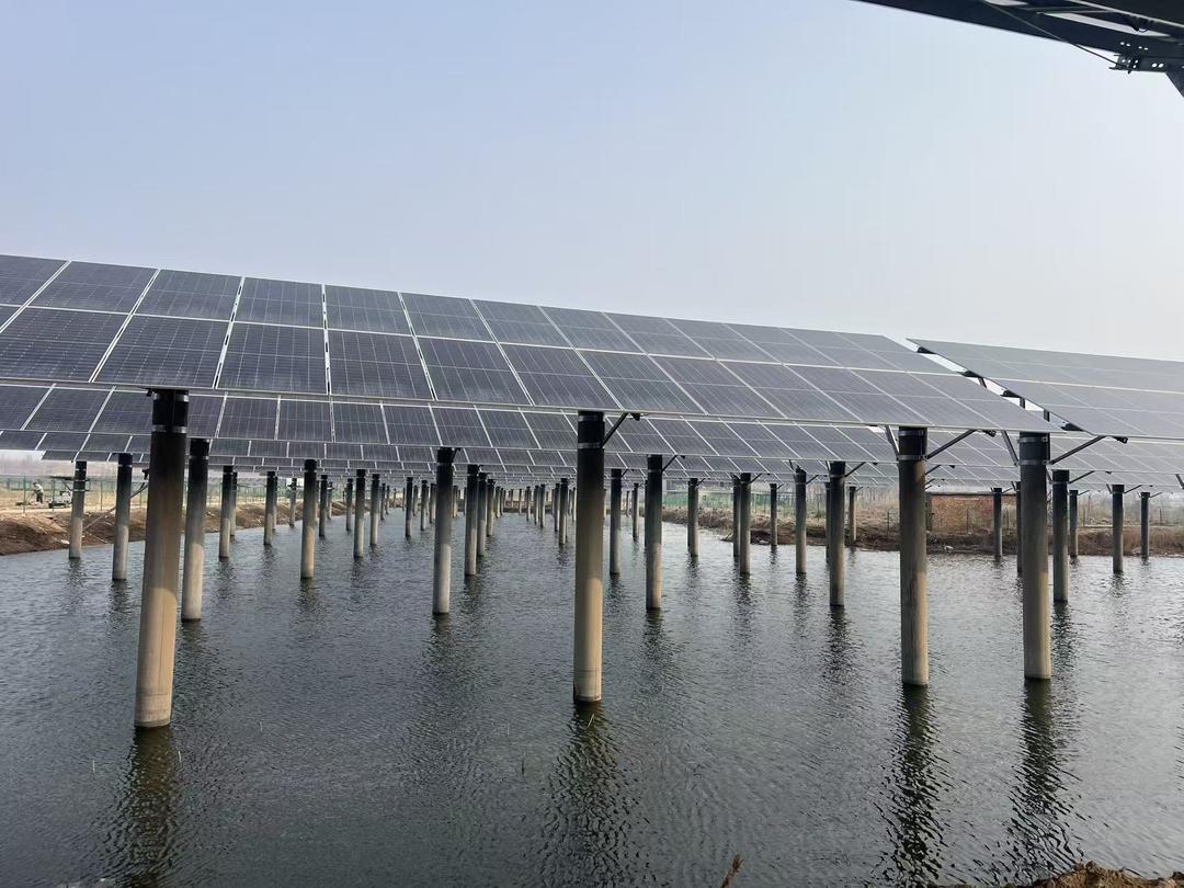 据了解,该项目打破传统单一养殖局限,坚持“先渔后光”建设原则,对千亩闲置鱼塘实施标准化改造,配套完善尾水处理设施。采用35米高跨距柔性支架,在保证渔业光照需求(遮光率<40%)的前提下,实现光伏发电与水产养殖空间的高效复用。引进黄河大闸蟹、罗氏沼虾等喜弱光特色水产品种,套种耐阴中药材,构建立体种养体系,大幅提升土地复合价值。