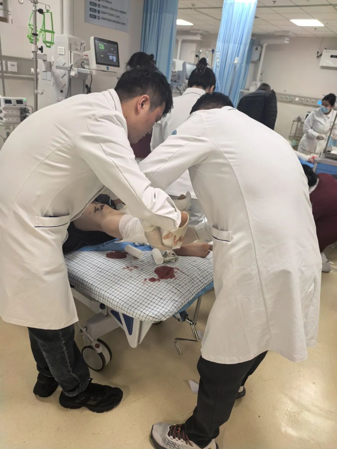 当日,接到出诊指令后,北院区急诊医学中心院前急救科第一时间奔赴现场,快速评估两名伤者伤情,均为严重多发伤,生命体征不稳定,形势万分危急。急救人员一边紧急处置开放性伤口、控制活动性出血,一边持续与院内急诊医学中心保持实时联络,将两名伤者的详细伤情、生命体征动态及初步判断及时回传至院内。急诊医学中心、麻醉科、手术部、重症医学科及相关外科在接到院前预报的第一时间,立即完成人员召集到岗、物资准备就绪、手术室预备启动等全链条部署,确保患者转运抵院后即可无缝衔接进入救治程序。院前阶段精准、高效的应急处置,为后续综合救治争取到了至关重要的时间窗口。