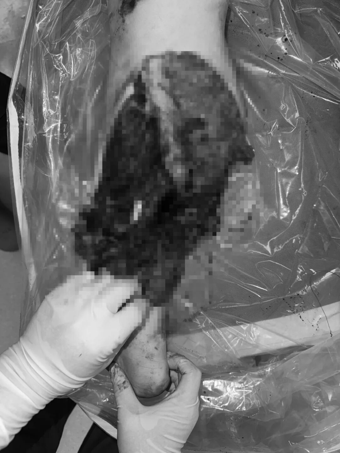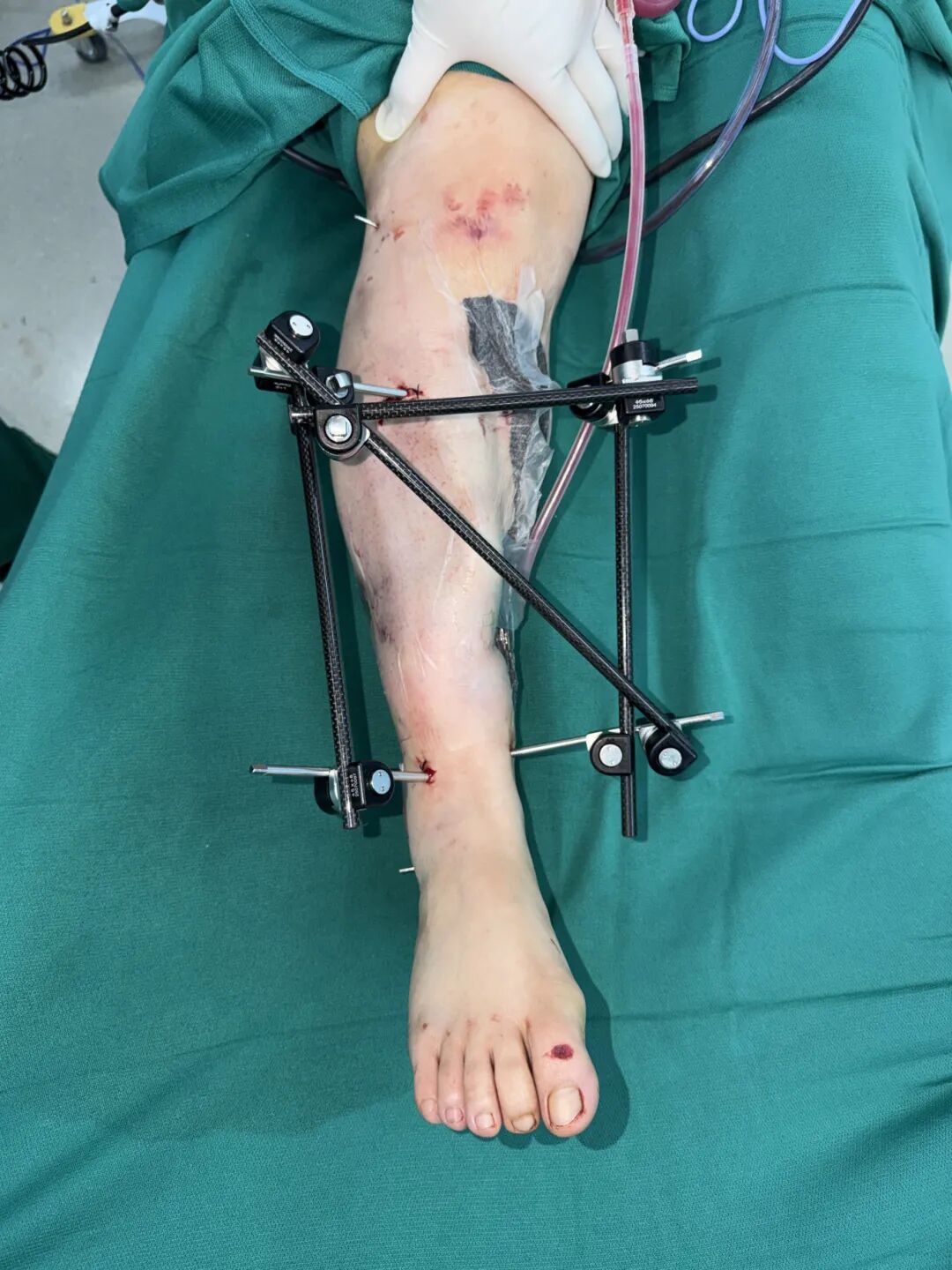 另一名伤者黎女士(化名)伤情令在场所有医护人员为之揪心。右侧小腿遭受极度严重的毁损性创伤,创面长达约50厘米,肌肉组织大面积外露,骨折断端裸露于外,整条小腿几近完全离断,仅凭残存的一小片皮肤相连,左足已呈现苍白、无血运的缺血危象,肢体存活与否悬于一线。与此同时,她还合并颈椎附件损伤、多发肋骨骨折、右侧锁骨骨折、双肺坠积性改变等多处严重损伤,全身情况极度不稳定。面对如此复杂的伤情,手外科/足踝外科汪洋团队争分夺秒,在MDT框架下迅速集结,在最短时间内制定出科学、可行的分阶段救治方案,全力探查、吻合受损血管神经、重建肢体血液循环的同时,兼顾多处骨折的清创固定,力求以最小的创伤代价保住这条几近失去的肢体。手术过程惊心动魄,每一步操作都是对医疗团队技术与协作的极限考验。