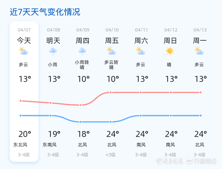 今天是4月7日,星期二,农历二月二十。菏泽市今天天气多云,气温介于13℃至20℃之间,东风2级,空气湿度78%,PM2.5指数为86。各区整体天气状况良好,多云为主,局部地区偶有微风,总体适宜户外活动。明天(4月8日)菏泽市天气将有明显变化,预计为小雨天气,气温略有下降,介于13℃至19℃之间,风力为东南风3-4级。与今天相比,明天的降雨天气将对市民出行造成一定影响,提醒市民提前做好防雨准备。未来三天(4月9日至4月11日),菏泽市天气趋势为周四小雨转晴,气温10℃至18℃;周五多云转晴,气温10℃至24℃;周六多云,气温13℃至24℃。期间,周四和周五的气温波动较大,市民需注意及时增减衣物,周四降雨天气请注意防雨防滑。温馨提示