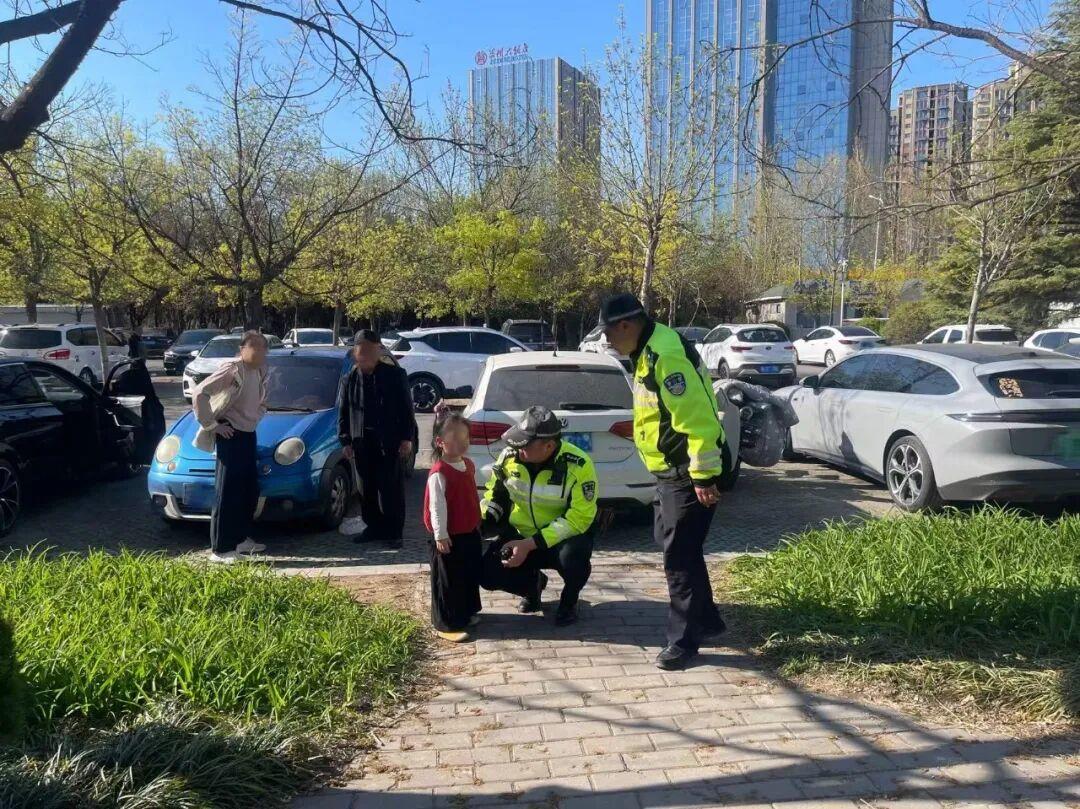 4月4日,清明节假期第一天,莒县交管大队城阳中队执勤人员在沭河公园路段巡逻时,发现一名小女孩独自在路边哭泣。执勤人员立即上前温柔安抚,耐心询问后得知,孩子与父母走失,焦急之下不知所措。