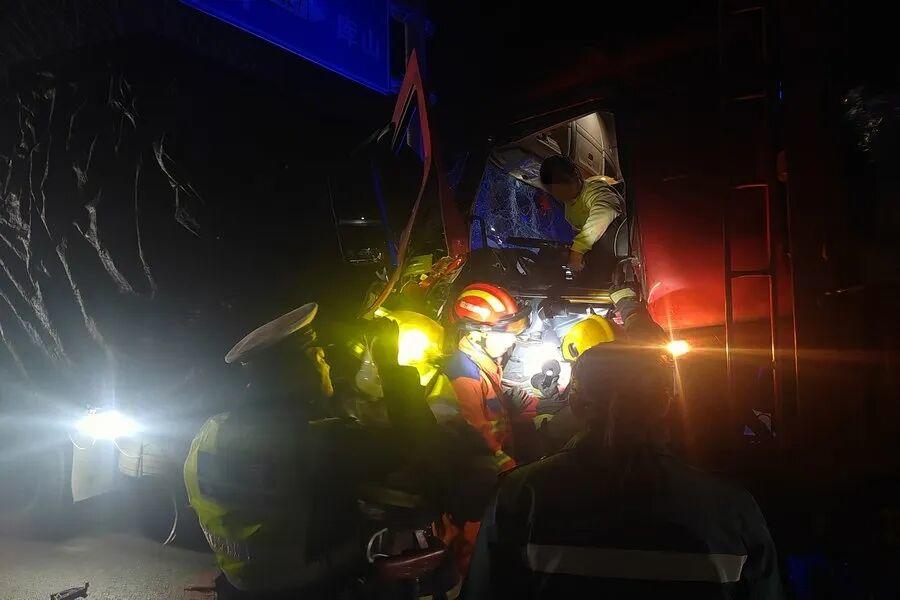 3月28日深夜,206国道于里镇管帅村路口,一辆重型货车与重型半挂牵引车发生追尾事故,重型货车驾驶室在剧烈撞击下严重变形,驾驶人被困其中、伤势不明。