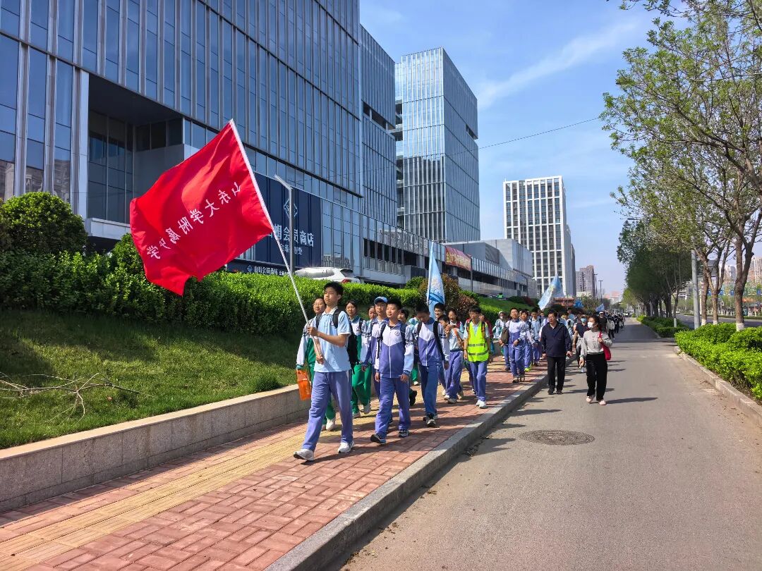 清晨的校园,清风拂面,庄严肃穆。初一年级全体师生身着整洁的校服,在操场整齐列队、集结待命。山东大学附属中学党委副书记、执行校长郑廷伟发表简短动员讲话,他深情寄语同学们:“用坚定的信念,引航成长之帆。张雪机车夺冠再次印证创新与爱国的力量,希望同学们在活动中砥砺意志,倾尽全力完成使命。”山东大学附属中学党委书记傅艺娜为同学们举行授旗仪式,随着一声“出发”的口令,各班高举鲜艳的班旗,迈着整齐的步伐,向着历城区烈士陵园开启了十公里徒步行进之路。春风微凉,却吹不散同学们心中的热忱;路途遥远,却挡不住大家追寻英烈足迹的坚定步伐。