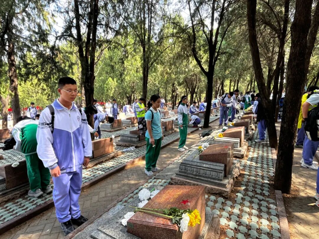 仪式结束后,各班分组开展祭扫活动。同学们小心翼翼地擦拭着墓碑上的尘埃,细致地清扫着墓前的落叶,动作轻柔而庄重,仿佛在呵护一份珍贵的记忆。每擦拭一块斑驳的墓碑,每默念一个年轻的名字,同学们的心中就多一份震撼与感动——这些英烈,有的正值青春年华,却为了祖国的解放、人民的幸福,毅然奔赴战场,用生命书写了不朽的爱国篇章。同学们纷纷在墓前献上手中的白菊,弯腰鞠躬,轻声诵读烈士生平,有的同学眼中泛起泪光,有的同学默默许下誓言:“请英烈放心,强国有我,护国有我!”