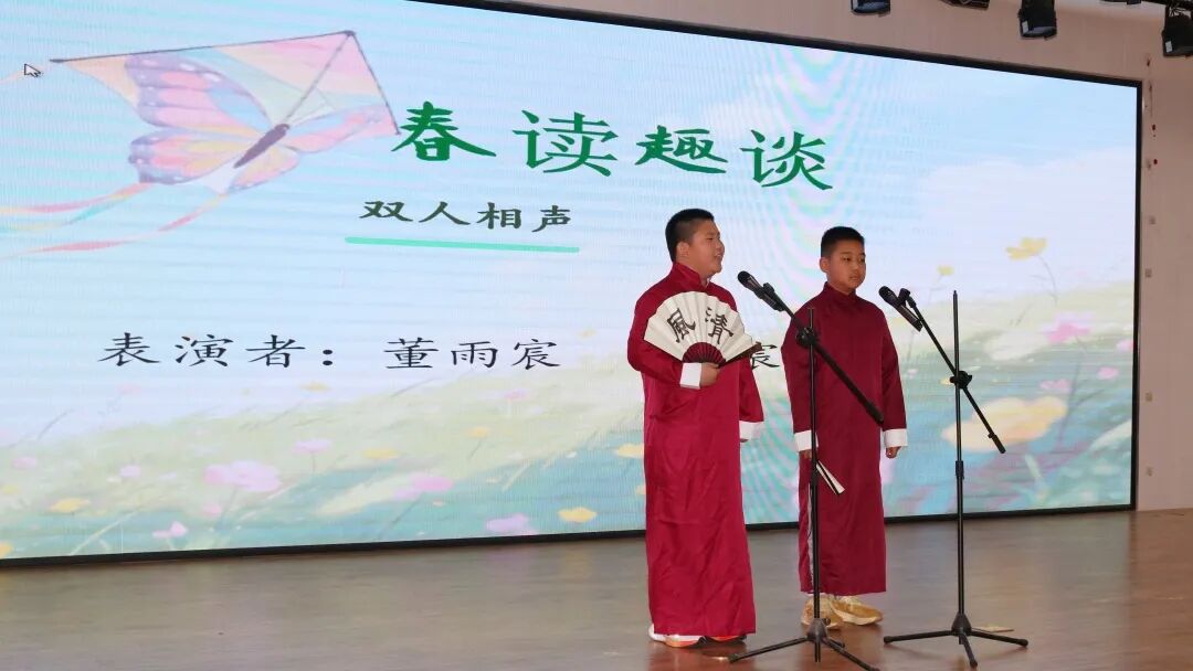 双人相声《春读趣谈》成为现场焦点,董雨宸、付继宸两位同学围绕春日读书与户外游玩展开趣味辩论,引经据典细数诗词中的春日盛景,表达对阅读的热爱,赢得阵阵掌声。六年级《书香少年上春山》节目,以灵动演绎展现学子与书香为伴、踏春向学的朝气,将现场氛围推向高潮。此外,现场还开展“古人笔下的春天”经典品读活动,《咏柳》《春晓》等诗词被逐一吟诵,孩子们在书声中感受诗词之美。