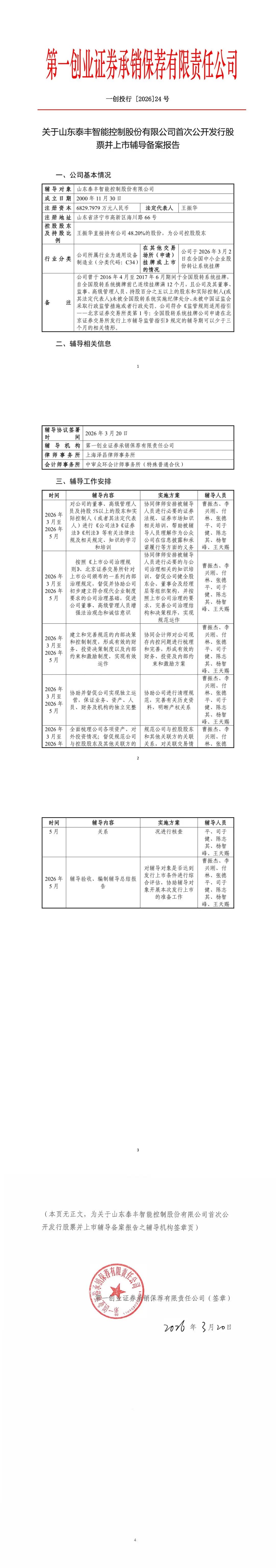 据证监会官网显示,山东泰丰智能控制股份有限公司(简称“泰丰智能”)于2026年4月2日正式启动上市辅导,辅导机构为第一创业证券承销保荐有限责任公司(简称“一创投行”)。