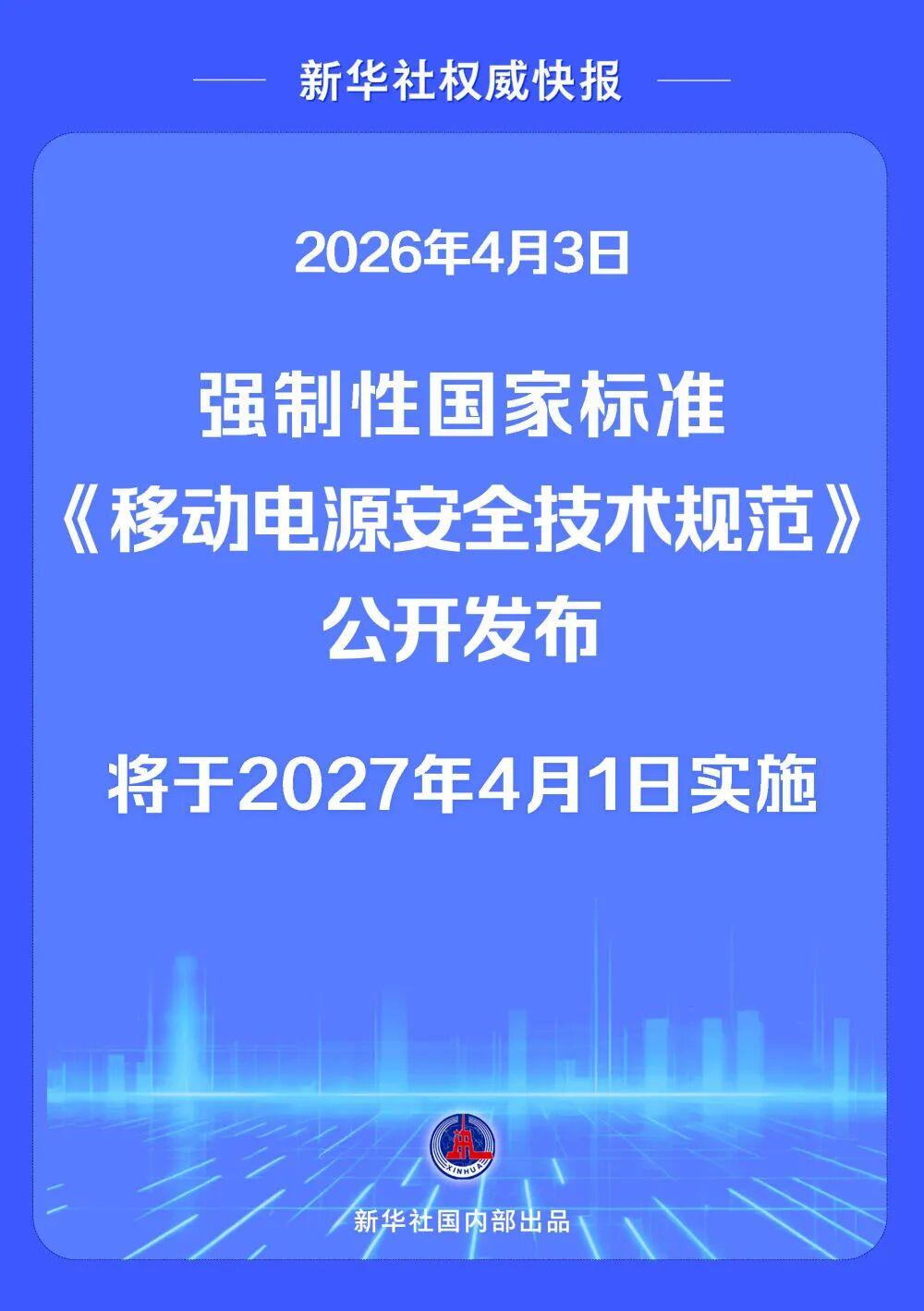 2026年4月3日,强制性国家标准GB 47372—2026《移动电源安全技术规范》公开发布,将于2027年4月1日实施,明确提升移动电源在高温、过充、挤压等滥用场景下的安全防护能力,新增循环老化后析锂检测,降低移动电源长期使用后的内部短路风险。