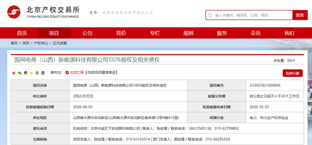 转让信息显示,山西新能源的转让底价为2902万元,其中,公司100%股权转让底价为1740万元,国网电商对山西新能源的债权转让底价为962万元,国网数字科技控股有限公司对山西新能源债权转让底价为200万元。