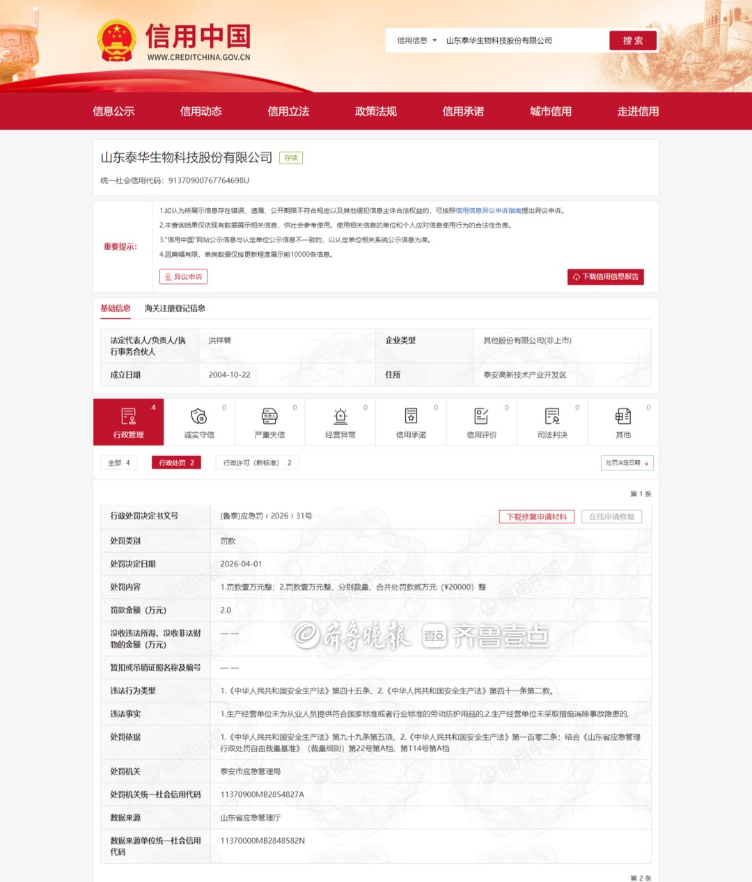近日,泰安市应急管理局发布行政处罚决定书(文号:(鲁泰)应急罚﹝2026﹞31号),山东泰华生物科技股份有限公司因存在两项安全生产违法行为,被合并处以罚款2万元。