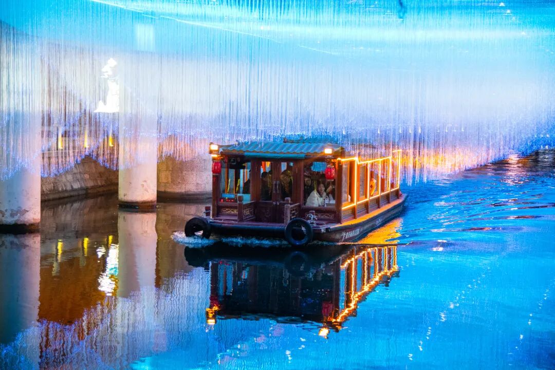 从黑虎泉码头登上画舫,泛舟护城河,看古桥载着蓝韵星河,在水波间诉说济南的浪漫与温柔,这才是泉城夜游的正确打开方式。“蓝韵龙桥”景观不仅为泉城夜游增添了一抹亮丽的色彩,更让古老的青龙桥焕发新的生机与活力,让济南深厚的泉水文化与独特的城市风情,以更加年轻、鲜活的姿态迎接八方来客,向世界传递城市的美好与温度。