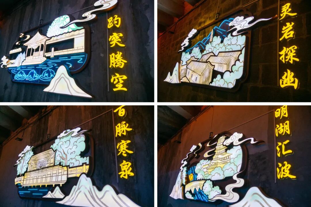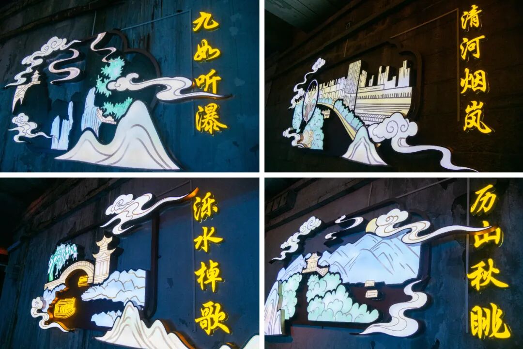 更具巧思的是,桥洞内壁同步点亮以“济南新八景”为主题的立体发光标识。百脉寒泉、灵岩探幽、明湖汇波、趵突腾空、九如听瀑、历山秋眺、泺水棹歌、清河烟岚八大盛景在眼前次第呈现。金属光泽与柔和灯光交相辉映,于泉畔桥洞间构建起古今交融的人文光影秘境。