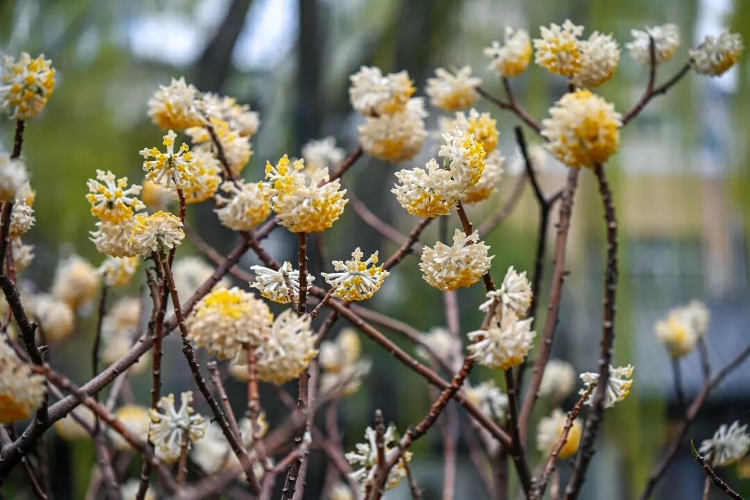 万竹园的结香花藏着小众惊喜,一簇簇金黄小花聚成绒球状,裹着淡淡的绒白,像一串串凝结的暖阳,浓郁的香气漫溢四方。
