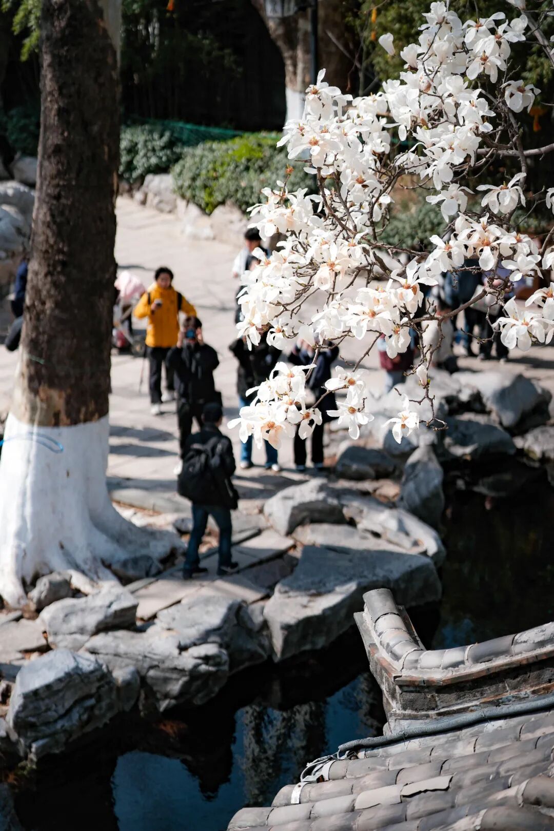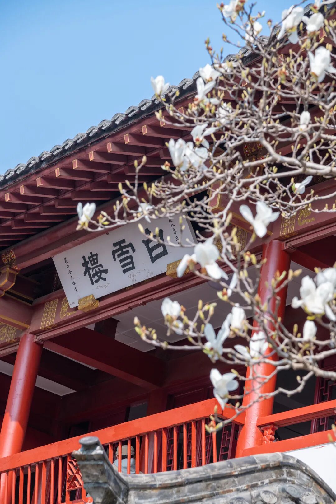 白雪楼前的玉兰花早已出圈,温润的白瓣似玉石雕琢,粉白的花瓣晕染着胭脂色,亭亭玉立在古建旁,花香伴着泉水叮咚,古韵与春意撞个满怀。