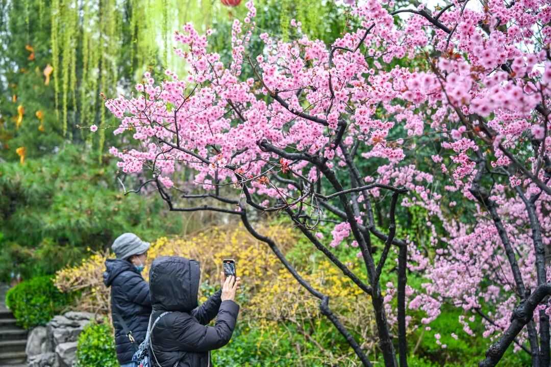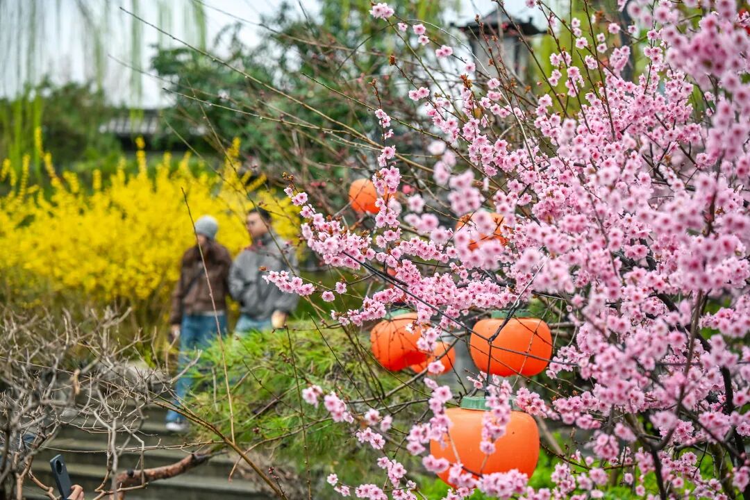 景区北门附近的美人梅则带着几分娇俏,粉艳的花瓣层层舒展,似少女颊边的胭脂,缀满小径,与翠绿的枝叶相映,艳而不妖。微风拂过,粉瓣轻扬,与喷涌的泉水相映成趣,每一处都藏着春日的柔情。