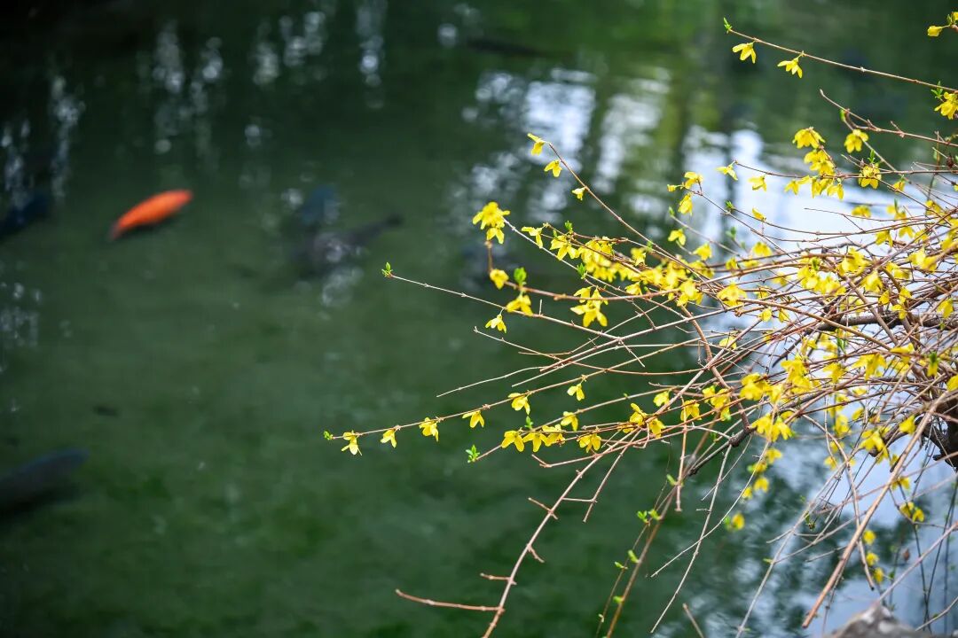 连翘已缀满泉畔的枝头,满枝金黄顺着枝条肆意舒展,像倾泻而下的金色流瀑,耀眼又鲜活,与青砖黛瓦、汩汩清泉相映,把古朴景致染成了春日的亮色。