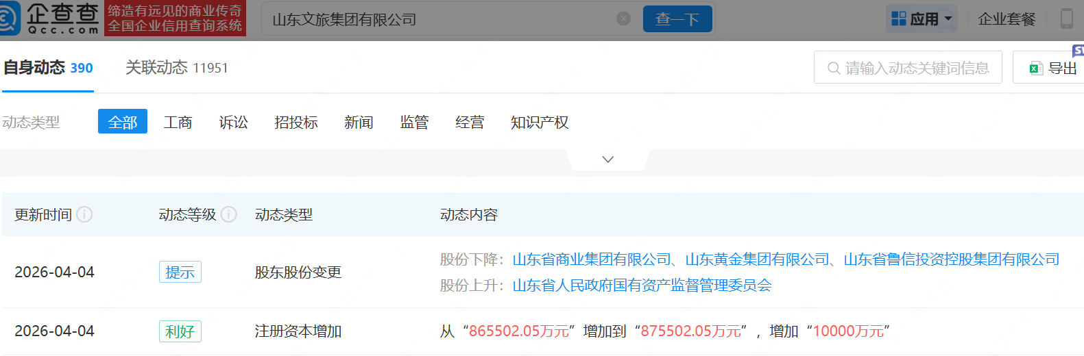 企查查显示,近日,山东文旅集团有限公司(下称“山东文旅集团”)注册资本由86.55亿元增至87.55亿元,股东股份也发生变更。