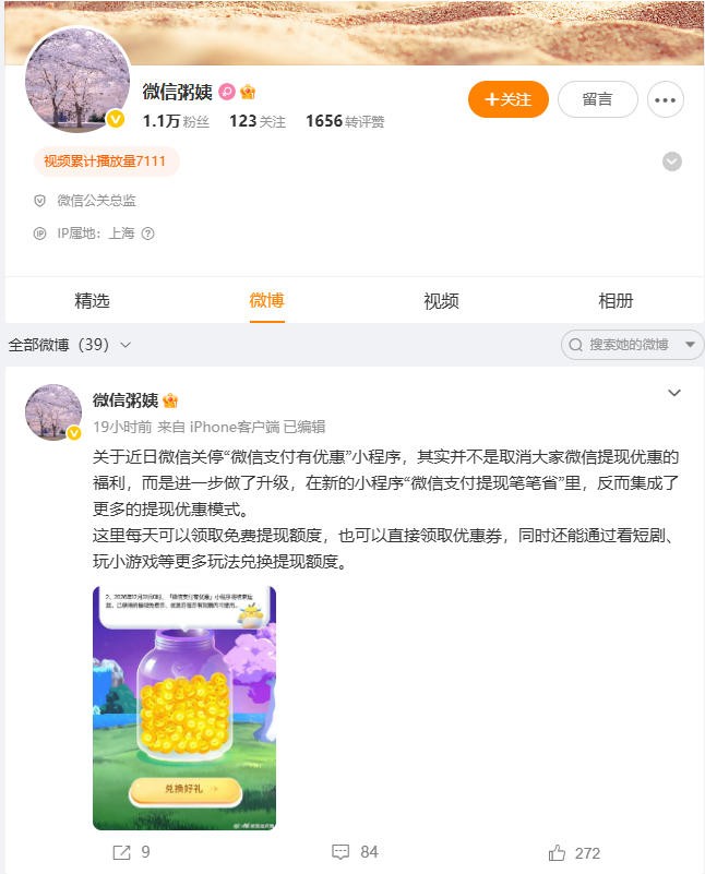 微信公关总监回应关停“微信支付有优惠” 在新的小程序里,集成了更多提现优惠模式