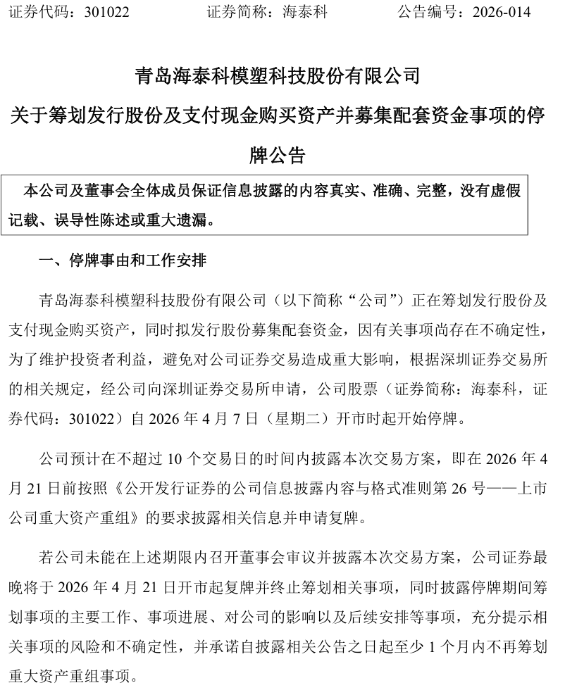 4月6日,海泰科(301022.SZ)发布公告称,正在筹划通过发行股份及支付现金的方式购买新三板挂牌公司青岛旭域土工材料股份有限公司(下称“旭域股份”)的控制权,并募集配套资金。公司股票自4月7日起停牌,预计停牌时间不超过10个交易日。