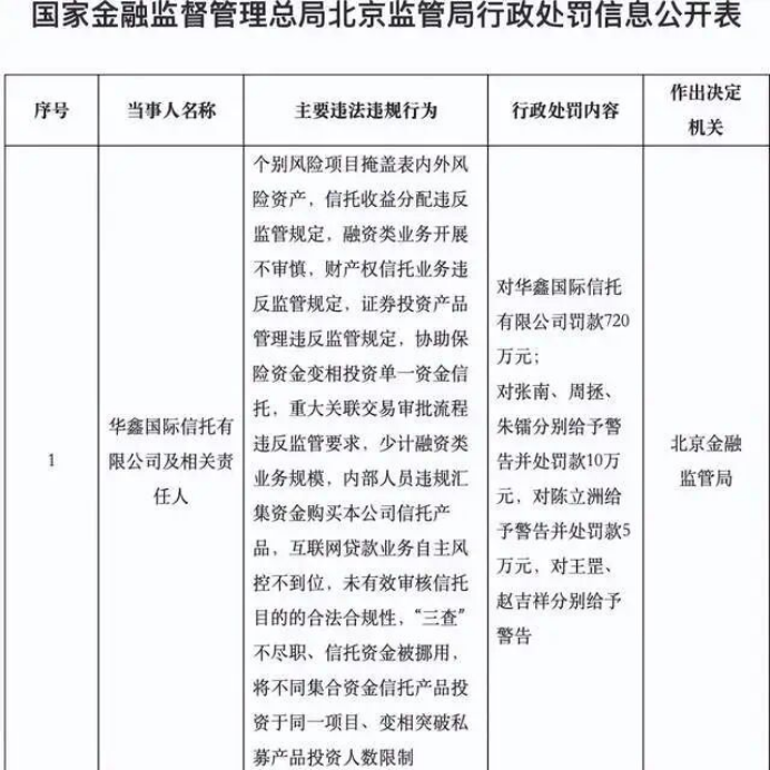 4月3日,国家金融监督管理总局北京监管局披露行政处罚信息公开表,华鑫国际信托有限公司因违法违规被罚款720万元。