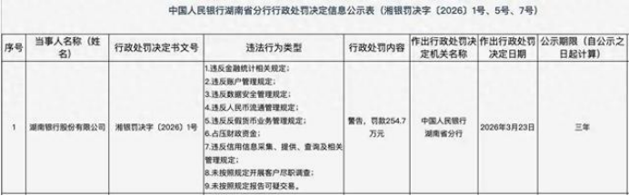 4月3日,中国人民银行湖南省分行发布行政处罚决定信息公示表显示,湖南银行股份有限公司因9项违法违规被警告并罚款254.7万元。