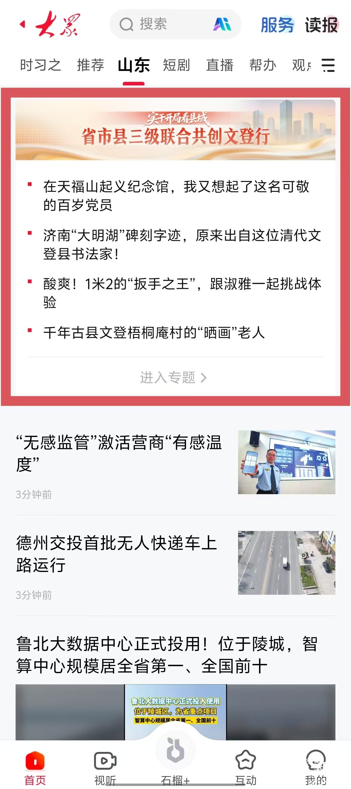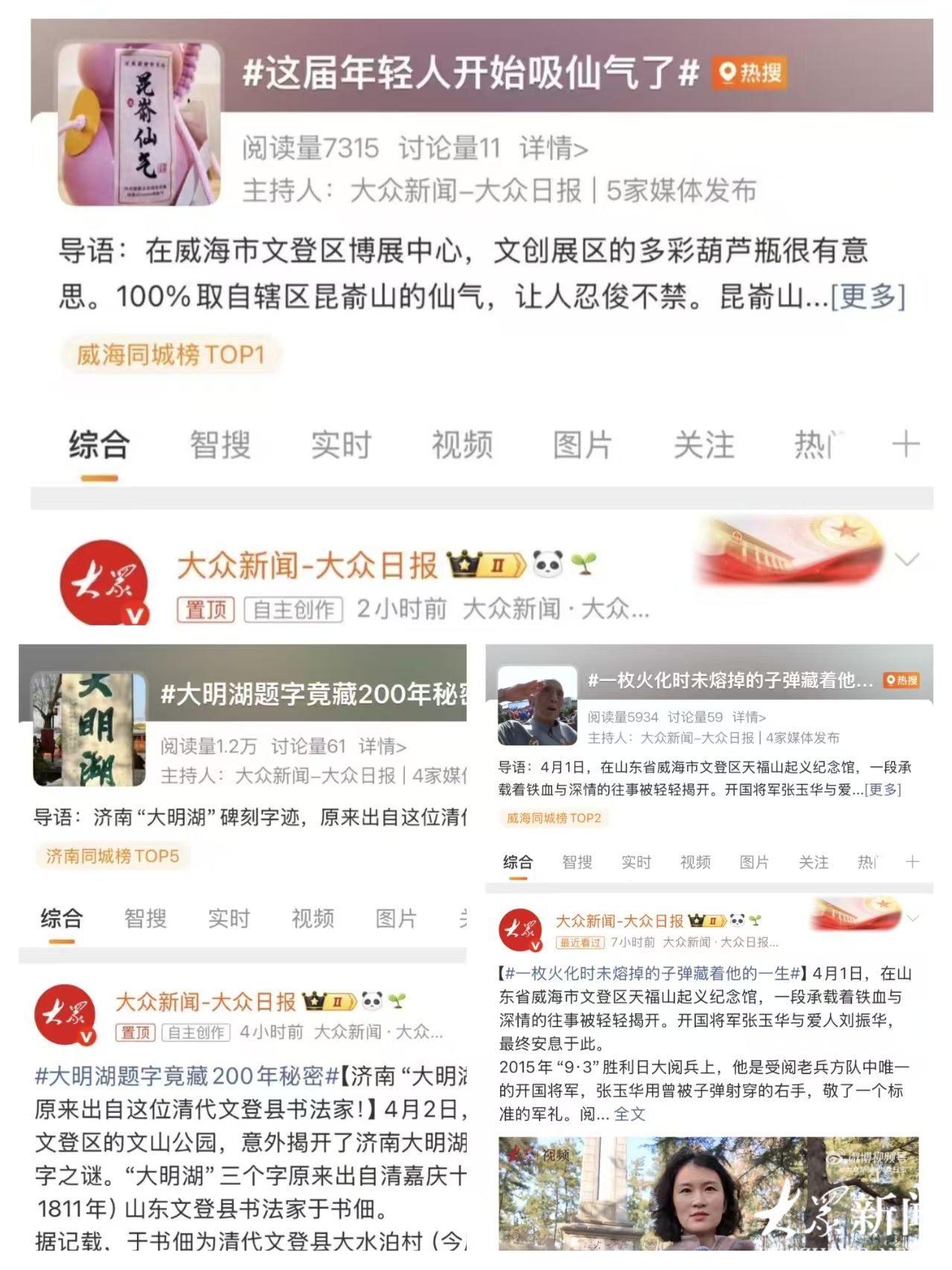 4月1日—3日,大众日报·大众新媒体大平台携手省市县三级融媒力量,走进威海文登,以“实干开局看县域”为主题,开展了一场为期三天的联合共创采访行。39件全媒产品,2056万传播量——这组数字背后,是一次主题报道与流量逻辑的深度碰撞,是一次红色基因、乡村振兴、制造底气与非遗传承的集中表达。