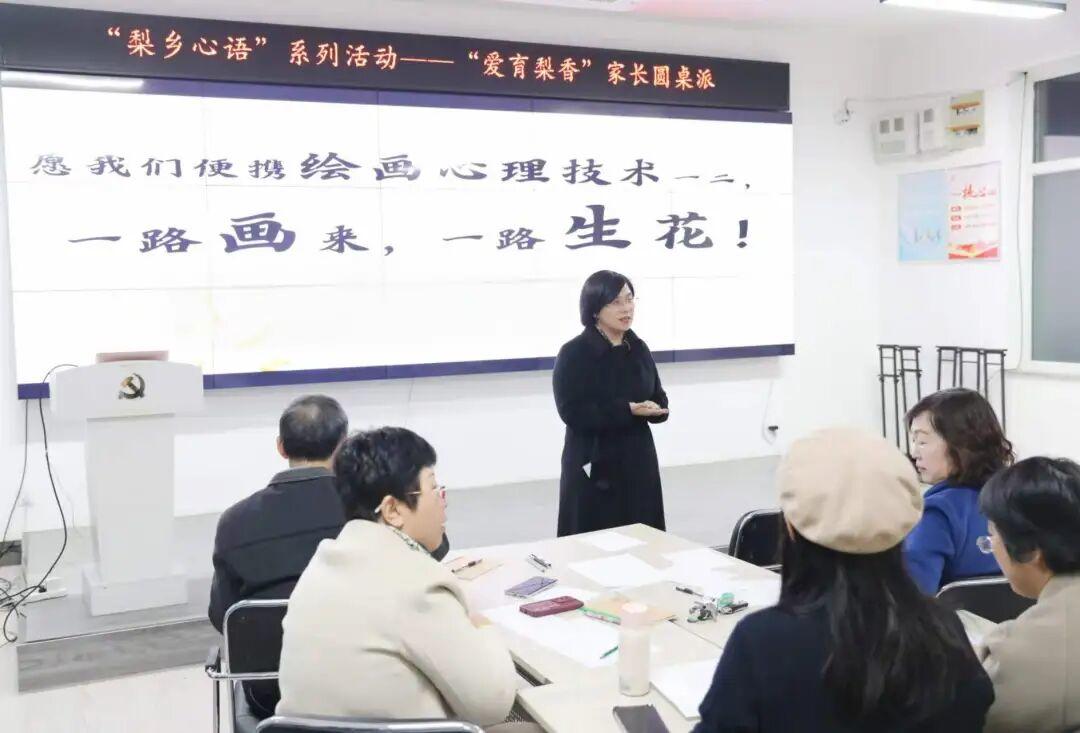 2025年11月11日,刘月玲(中)组织志愿者开展首期“爱育梨香”家长圆桌派活动。
